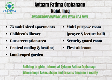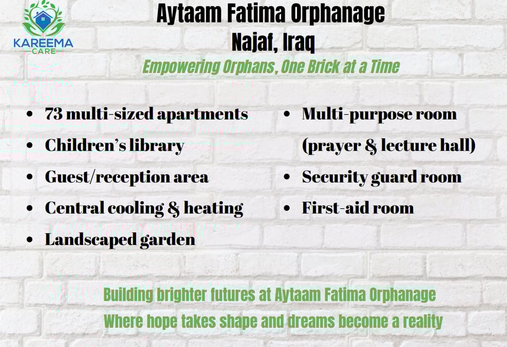 Kareema Care is excited to kick-off the AYTAAM FATIMA Orphanage project in the holy city of Najaf, Iraq, dedicated to providing a loving home for orphans in need. We aim to create a safe and nurturing environment for orphaned children and empower them to thrive and succeed. With your support and loving care, we will together build the orphanage and extend our hands to orphans and help to foster a sense of community and belonging. Join us in making a difference with each child under our care.